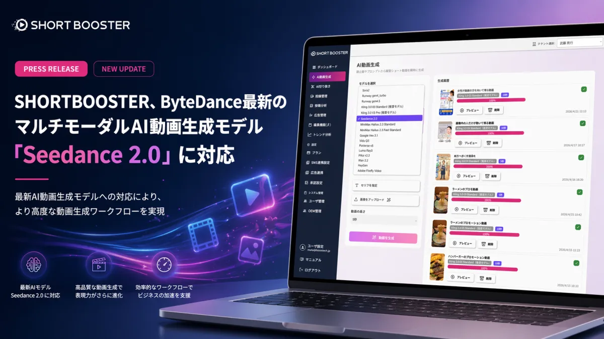 2026年4月29日、BOOSTTECH株式会社の提供するショート動画運用ツール「SHORTBOOSTER」が、ByteDance社の最新マルチモーダルAI動画生成モデル「Seedance 2.0」に対応しました。本モデルの登場により、SHORTBOOSTERで利用可能なAI動画生成モデルは14種類以上に増加し、ユーザーは用途に応じた最適なモデルを選択できるようになります。