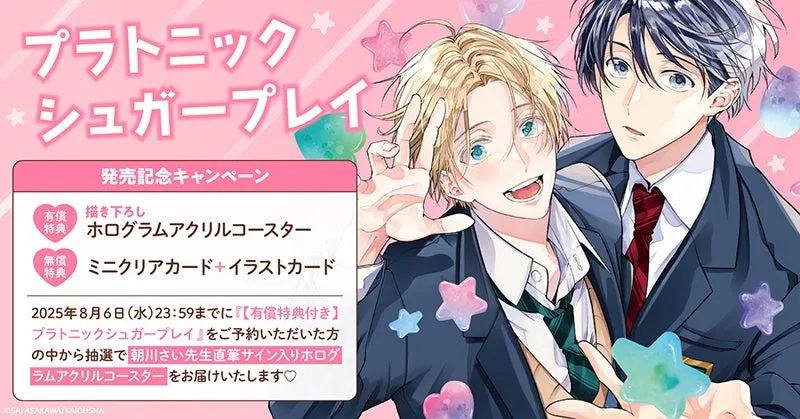 株式会社TORICOが運営するホーリンラブブックスにおいて、朝川さい先生の最新作『プラトニックシュガープレイ』の発売を祝う特別なキャンペーンが開催されています。このキャンペーンでは、期間中に特定の商品を予約した方の中から抽選で、直筆サイン入りのホログラムアクリルコースターが当たるという嬉しい特典が用意されています。