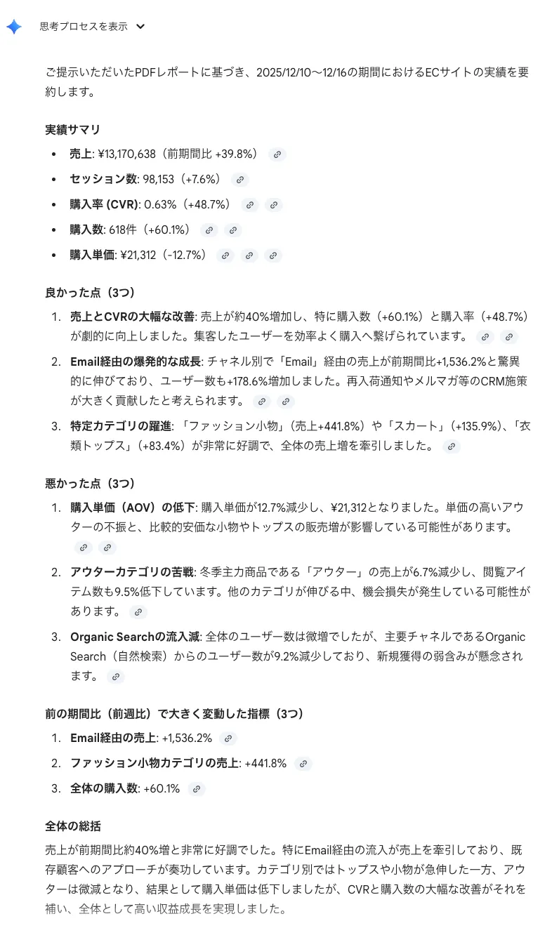 このテンプレートの特長として、GeminiとChatGPTそれぞれの役割を明確に分けている点があります。GeminiはPDFを高速で解析し要点を整理、一方でChatGPTはその情報に基づいてさらなる深堀りや改善提案を生成します。これにより、分析にかかる時間を大幅に短縮し、迅速な意思決定と施策検討を実現します。