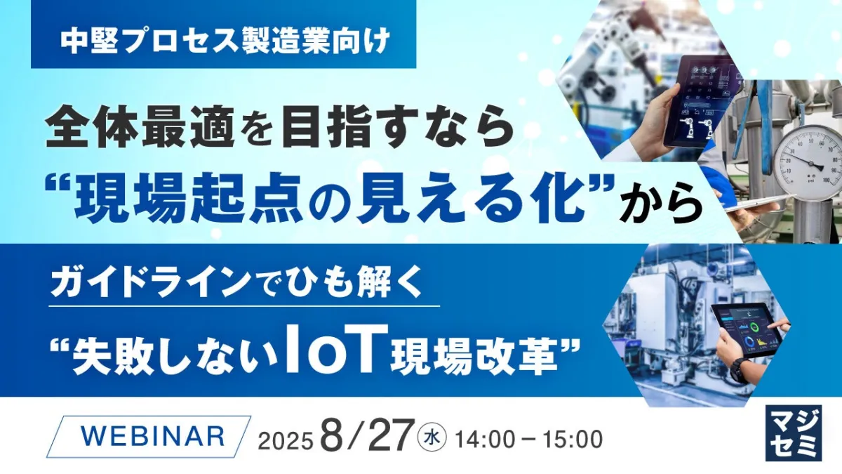 今回のウェビナーでは、プロセス製造業における全体最適を目指し、実際の成功事例を通じてIoTの導入と活用の具体的な方法を解説します。前半では、経済産業省およびNEDOから委託を受けた日本能率協会コンサルティングが策定した「スマートマニュファクチャリング構築ガイドライン」を紹介し、業務改革を成功に導くための実践的なステップをご紹介します。