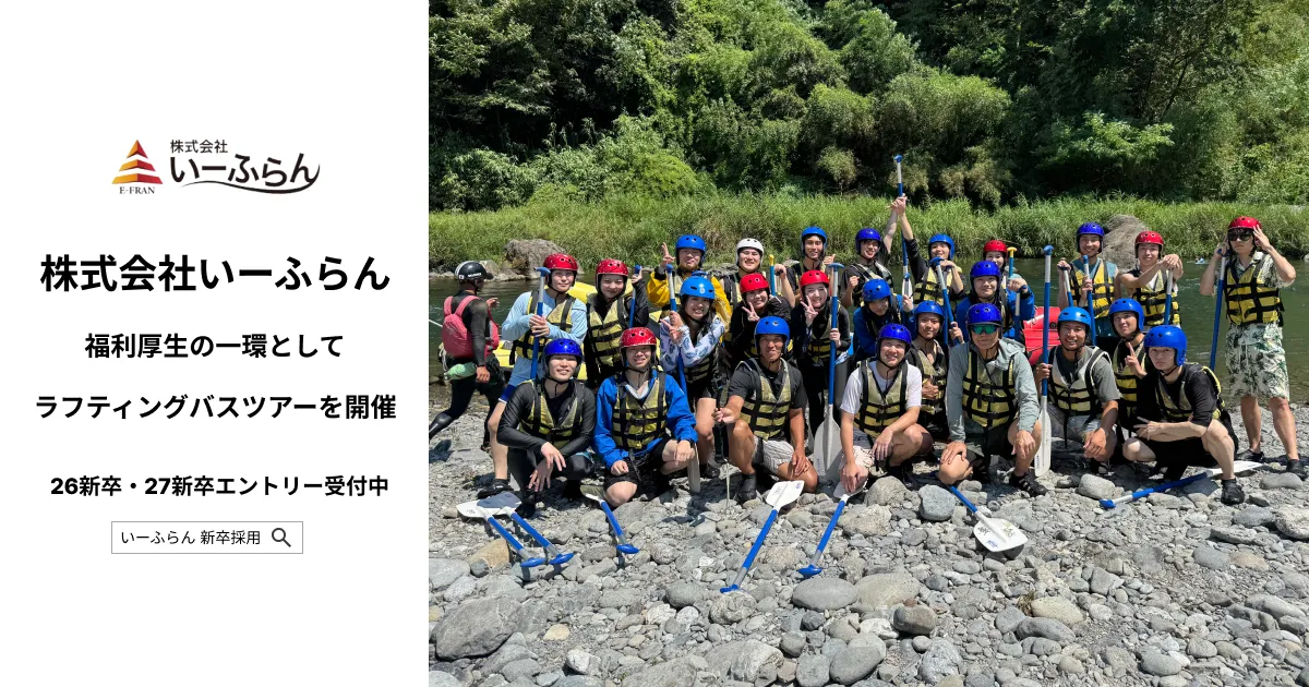 株式会社いーふらんが、福利厚生の一環としてリムジンバスを利用した社内バスツアーを開催しました。今回は、奥多摩でラフティングに挑戦し、社員たちが大自然の中でアクティブな一日を体験しました。