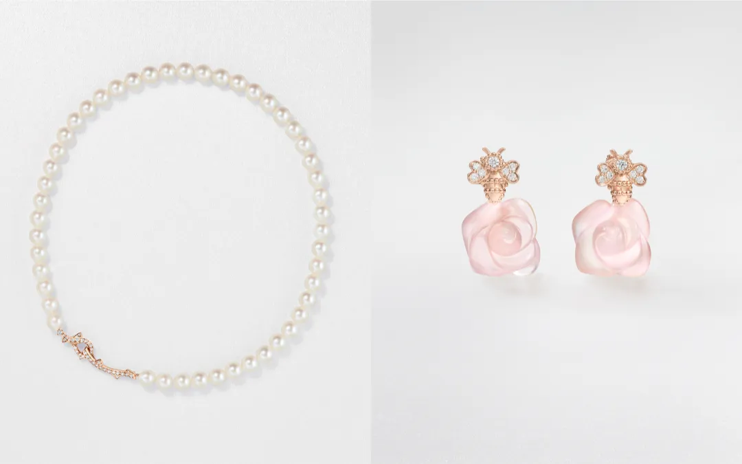 「ラ ローズ ディオール」のコレクションでは、「ボワ ドゥ ローズ」シリーズから特別な2つのネックレスが登場します。ひとつはホワイトゴールド製で、シンボリックな薔薇の茎と棘のモチーフがあしらわれており、洗練された印象を持っています。もうひとつは「ボワ ドゥ ローズ」から初めて登場する淡水パールを使用したデザインで、ピンクゴールド製のシグネチャークラスプが特徴。柔らかな輝きが、より一層の魅力を引き立てることでしょう。