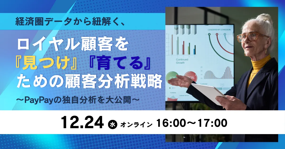 このセミナーでは、「経済圏」の最新の動向を把握しながら、さらに深く進んで自社の顧客分析手法を学ぶことができます。特に、PayPayのデータ分析の実績を基にした具体的な事例を紹介し、実践的なプロセスを共有します。この機会を通して、データからどのように顧客のインサイトを得て、施策に結び付けるのかを理解することが期待できます。