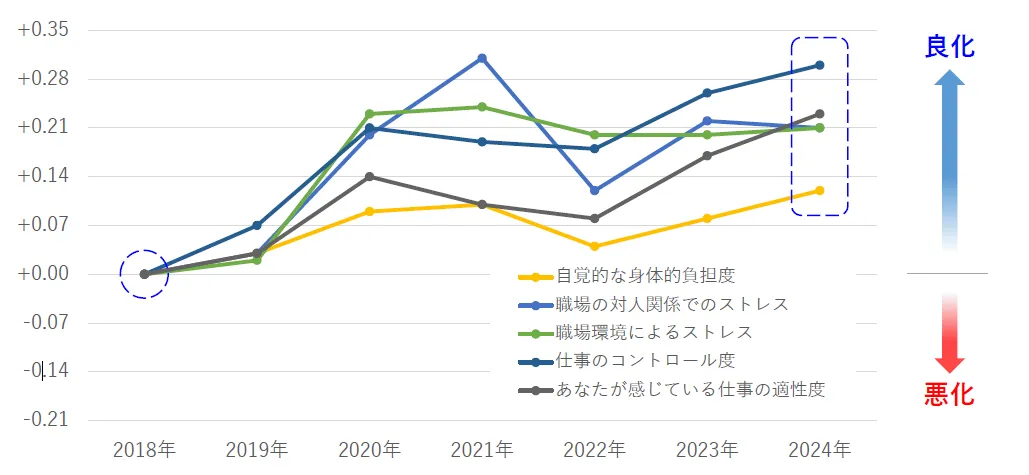 ストレスチェックでは、ストレスの原因を複数の項目に分けて測定しています。特に注目すべきは、スキルの活用度に関する結果です。調査結果では、20代と30代は近年「技能の活用度」が改善していますが、40代と50代はその感覚が薄れていることが示されました。これは、過去3年間で新しい働き方や技術が急速に進化したことに起因しています。