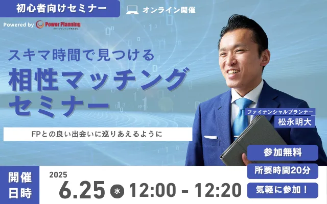 アットセミナーは、6月25日(水)12時より「相性マッチングセミナー」をオンラインで開催します。このセミナーでは、講師の松永明大FPと話すことで、あなたに合ったファイナンシャルプランナー(FP)を見つける手助けをします。参加は無料で、定員は10名と限定されているため、お早めの申し込みをお勧めします。