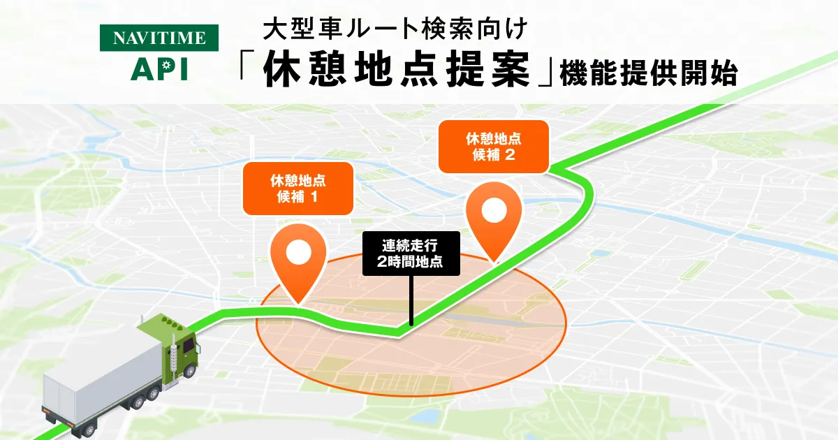 株式会社ナビタイムジャパンは、2025年9月26日から法人向け地図・ルート検索API『NAVITIME API』に新機能を追加します。この機能は、大型車向けのルート検索APIにおいて、運転者が適切に休憩を取るための「休憩地点提案機能」です。