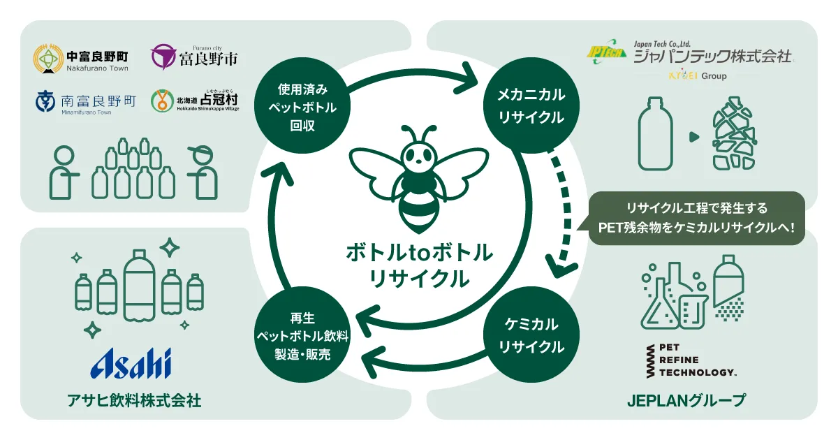 2023年2月9日、株式会社JEPLANのグループ会社であるペットリファインテクノロジー株式会社は、中富良野町、富良野市、南富良野町、占冠村、アサヒ飲料株式会社、ジャパンテック株式会社とともに、「ペットボトルの水平リサイクルの実施に関する協定書」を締結しました。この協定は、国内におけるPETボトルの循環利用を促進するための重要なステップです。