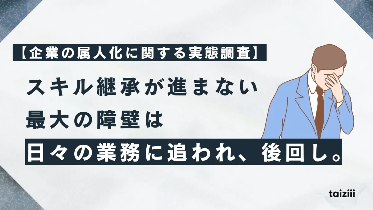 株式会社taiziiiは、管理職200名を対象に「企業の属人化・技術継承に関する実態調査」を実施しました。この調査は、スキル継承が進まない理由を探るためのもので、多くの企業が抱える共通の課題を浮き彫りにしました。