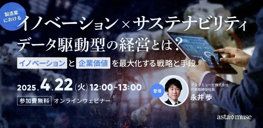 製造業は、現代の挑戦に直面しています。気候変動、パンデミック、そして技術革新は、企業の運営方式や経営判断に大きな影響を与えています。アスタミューゼ株式会社は、そんな時代に即した経営の在り方を探求するための無料ウェビナーを再度開催します。このウェビナーでは、「製造業における『イノベーションxサステナビリティ』データ駆動型の経営とは?」というテーマのもと、最新の経営戦略と手法を深く掘り下げていきます。