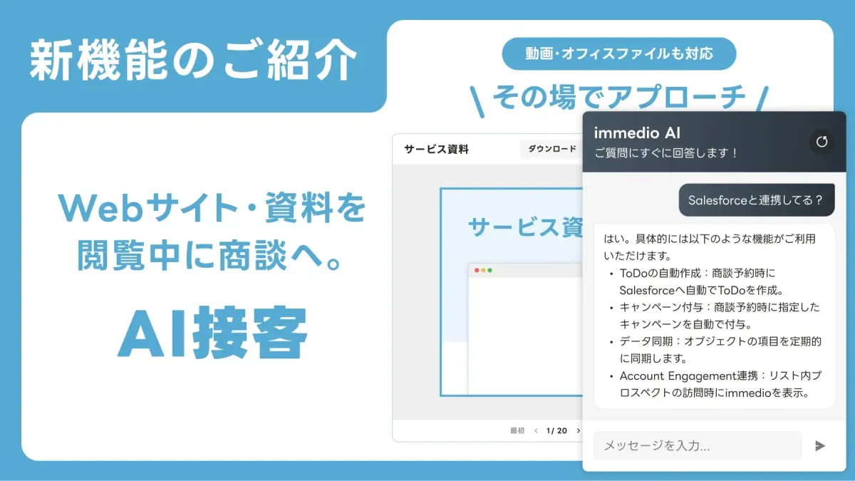 株式会社immedioが新たに開発したAIインサイドセールス「immedio」には、ウェブサイトの訪問者や資料を閲覧するユーザーに対して、リアルタイムでアプローチが可能なAI接客機能が搭載されました。この機能は、顧客が問い合わせを行う前から接触を可能にし、検討中の顧客との新たな接点を生み出すことを目的としています。