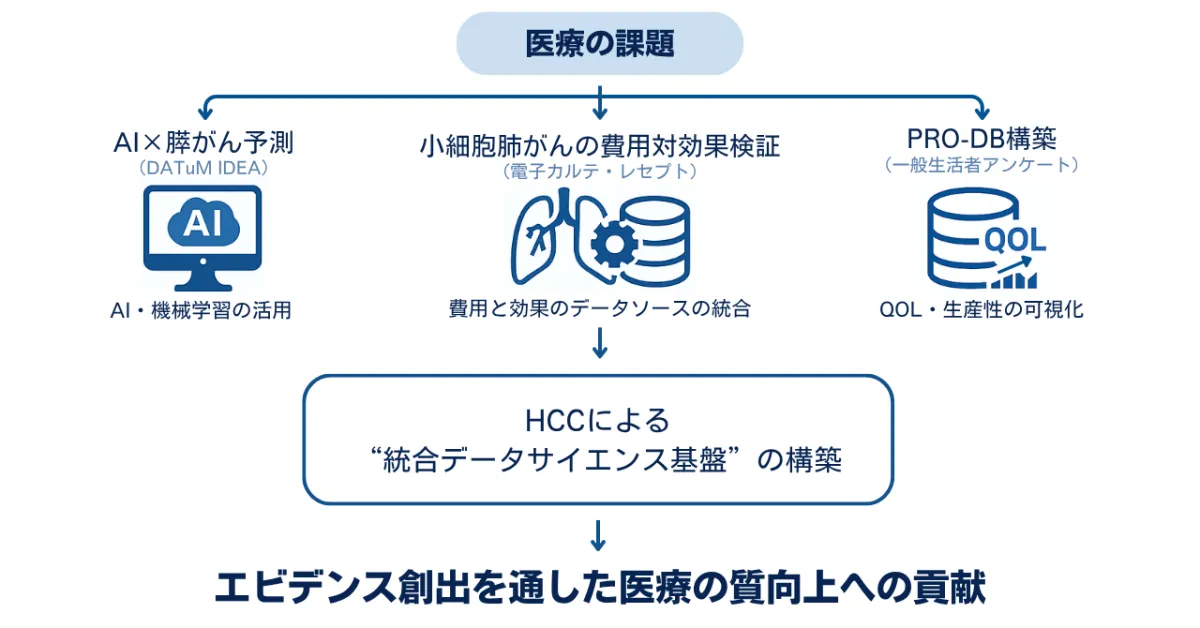 HCCは、膵臓がんや小細胞肺がんといった難治性疾患に対する早期発見とコスト効果の高い治療アプローチを開発しています。AIを用いた研究によって、膵臓がんの早期兆候を特定することを目指しており、これはTOPPANホールディングスが管理する医療データ基盤「DATuM IDEA」から解析するデータを用いています。