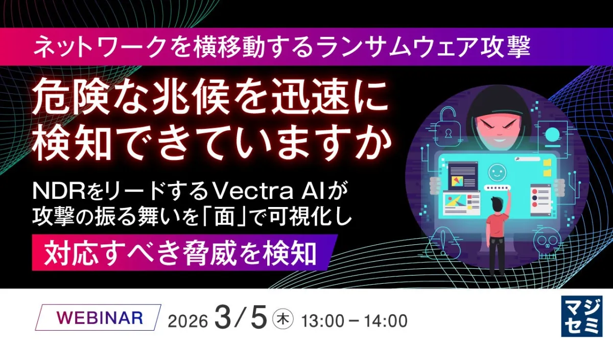 このような課題に対し、ガートナーが認定したNDR(ネットワーク検知とレスポンス)リーダーの一つであるVectra AIは、攻撃を「面」で可視化することによって、優先的に対処すべき脅威を検知するソリューションを提供しています。ウェビナーでは、このVectra AIプラットフォームの詳細が紹介されます。ネットワーク、ID、クラウドを横断的に分析し、Attack Signal Intelligenceを活用して本当に重要な攻撃シグナルを抽出し、対応へと繋げる手法を学べます。