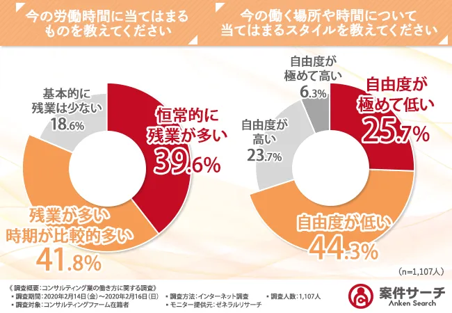株式会社ヒューマン・コネクトが実施した調査によると、残業が恒常的に多いと感じているコンサルタントは約8割に上ります。特に、39.6%の人が「恒常的に残業が多い」と回答し、さらに41.8%が「残業が多い時期が比較的多い」と続いています。これに対して、働く場所や時間の自由度については、7割が「自由度が低い」と感じており、コンサルタントの労働環境は厳しい現実に直面しています。