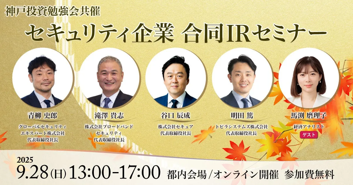 2025年9月28日(日)、神戸にて個人投資家向けの「神戸投資勉強会共催 セキュリティ企業 合同IRセミナー」が開催されます。このセミナーは、特にセキュリティ業界に焦点を当てたものであり、トビラシステムズ株式会社、グローバルセキュリティエキスパート株式会社(以下、GSX)、株式会社ブロードバンドセキュリティ(以下、BBSec)、株式会社セキュアの4社が一堂に会し、各社のビジネスについて詳しく説明します。