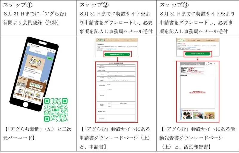 申請期間は2025年8月31日まで。方法は簡単で、まずは「アグらむ新聞」のLINE会員に登録し、その後、特設サイトから申請書をダウンロードして提出するだけです。活動が終わった後には報告書の提出も求められます。優れた活動は「アグらむアワード」として表彰され、農業新聞にてその活動内容が紹介されることもあります。