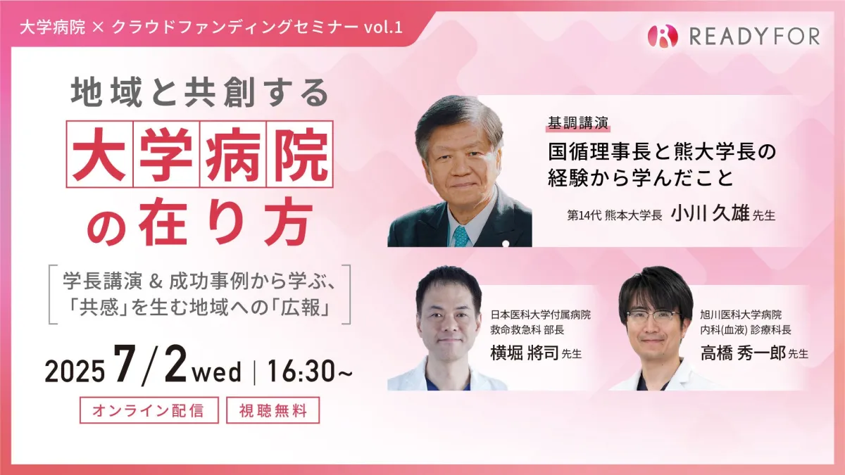 主催のREADYFOR株式会社は、日本初のクラウドファンディングサービスを展開する企業で、今回のセミナーでは大学病院が地域住民とどのように連携し、共感を生む広報手法を学ぶ機会が設けられています。