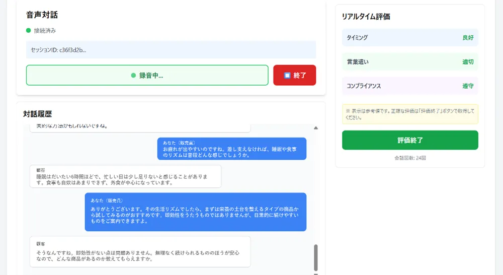 ツールは、仮想顧客との対話がAIによって解析され、販売トークの質が数値化されます。特に法令に関する重要なポイントや顧客満足度を考慮しながら評価が行われ、個々の販売員の成績が蓄積されます。このプロセスにより、従来の主観的な指導からデータに基づく結果重視の評価へと進化します。