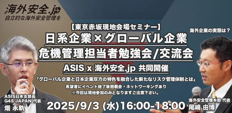 2025年9月3日(水)、東京都港区赤坂付近にて、海外安全.jpとASIS日本支部主催の勉強会・ネットワーキングイベントが開催されます。このイベントでは、日系企業とグローバル企業の危機管理担当者が集まり、最新の危機管理の知識やネットワークを拡充します。テーマは「グローバルおよび日本のセキュリティ発想の違い」となっており、参加者は実務知識の共有や新たなコミュニティの形成を目指します。