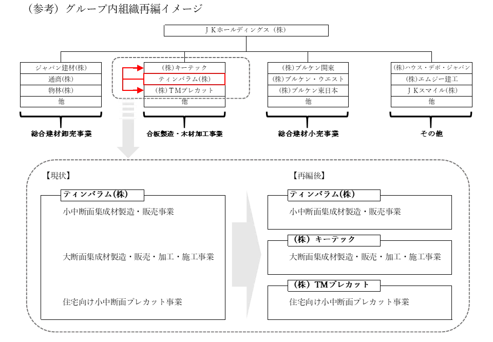 JKHDの組織再編後、ティンバラムは大断面集成材の業務をキーテックに承継し、住宅向け小中断面プレカット事業はTMプレカットに移管されます。これにより、JKHDグループはより一体的な運営体制を確立し、各事業の競争力を高めることを狙っています。