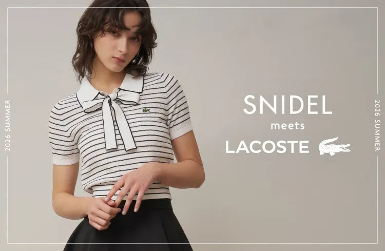 今回のコレクションには、2つの主力アイテムがラインナップされています。まず、目を引くのが「LACOSTEボウタイポロニットプルオーバー」(価格:25,300円)です。このアイテムは、鹿の子編みのニット素材を使用し、LACOSTEのスポーティな姿勢とSNIDELの女性らしさを見事に融合させています。取り外し可能なリボンは、細いラインのデザインが施されており、さりげなくもフェミニンな印象を加えています。丈感も短く、大人っぽくカジュアルな着こなしが楽しめる一枚です。