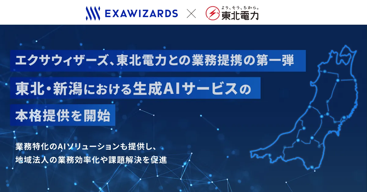 株式会社エクサウィザーズは、東北電力株式会社との業務提携を通じて、東北および新潟地域における法人向け生成AIサービス「exaBase 生成AI」の提供を開始することを発表しました。この取り組みは、2024年8月に発表された両社の業務提携に基づいており、エクサウィザーズのAI技術と東北電力の事業資産を活用することで、地域企業の業務効率化や人手不足解消を目指すものです。