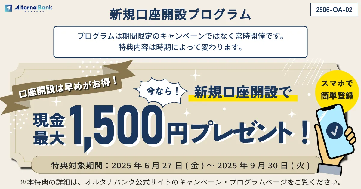 投資を始めたいと考えている方は、ぜひオルタナバンクの新規口座開設プログラムを利用して、お得な特典を手に入れましょう。詳細や注意事項は公式サイトで確認可能です。