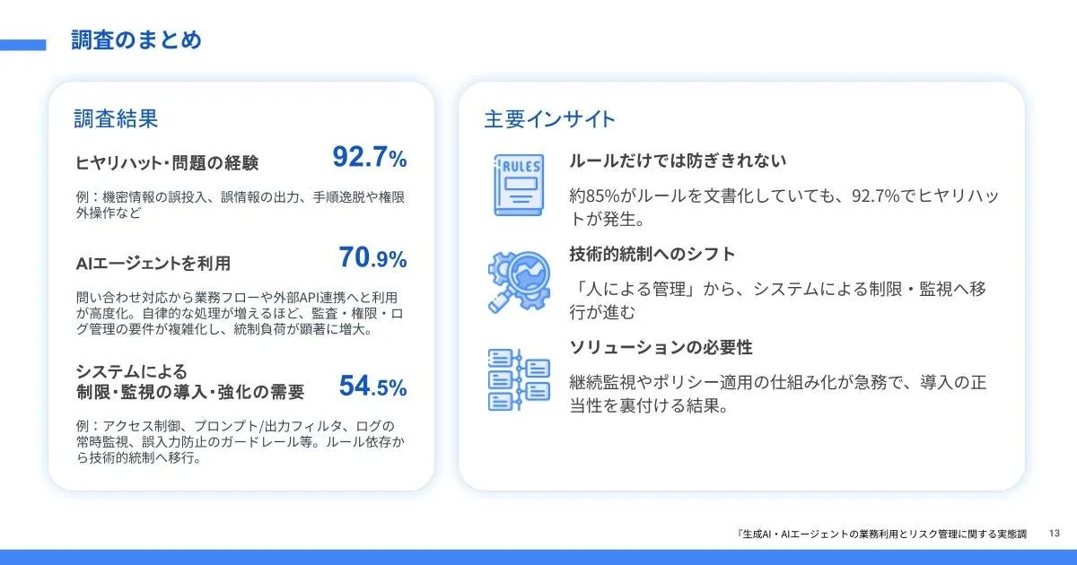 この調査は、2025年12月19日に実施され、主に経営企画や情報システム、DX推進、事業開発の各分野から担当者が回答しました。調査内容については、特定の情報を文書化している企業全体の85%がルールを策定しながらも、92.7%が過去1年間に「ヒヤリハット」、つまり問題が生じる可能性を経験したと答えています。これは、生成AIの利用が進む中で注意が必要だと指摘するデータです。