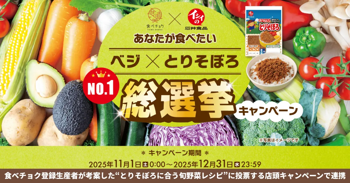 本キャンペーンでは、全国の食べチョクに登録している生産者たちが、自ら育てた旬の野菜にぴったりの“ベスト・オブ・とりそぼろレシピ”を考案。このレシピと、石井食品の人気商品「とりそぼろ」が数量限定でプレゼントされる特典が用意されています。さらに、店頭で購入した対象商品のレシートを用いて、野菜レシピに投票できる「ベジ×とりそぼろ総選挙キャンペーン」も同時に実施されます。