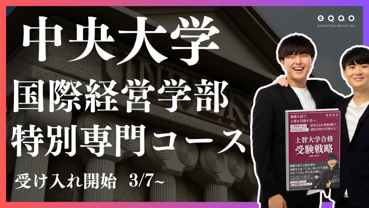 今年度の入試対策を強化するため、総合型選抜に特化した専門塾EQAOが中央大学国際経営学部向けの個別対策クラスの増枠を発表しました。この新たなクラスは、同学部に合格を目指す受験生にとって心強いサポートとなります。EQAOは、中央大学の入試に精通した講師陣が全力で指導し、夢の実現をお手伝いします。
