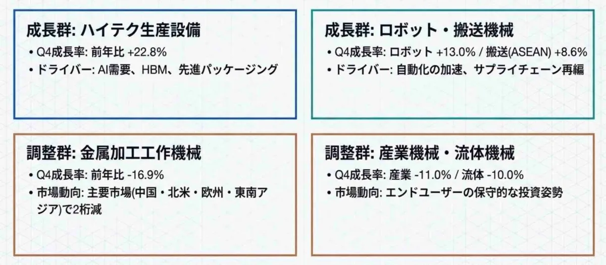 2025年の生産額は推計で1兆445億台湾元に達し、前年比3.9%の成長を見込む中で、ハイテク生産設備だけが飛躍的に成長を遂げたことが特筆されます。AIと自動化の進展がこの構造転換を後押ししており、2026年もこの流れは続くと予想されています。
