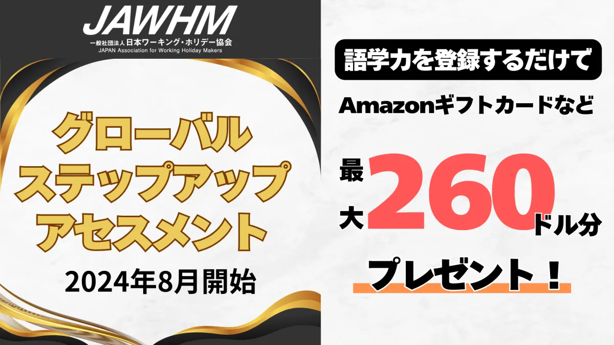 2024年8月より、一般社団法人日本ワーキング・ホリデー協会が新たに導入する「グローバル・ステップアップ・アセスメント(GSA)プログラム」をご紹介します。このプログラムは、海外で語学を学ぶ皆さんの語学力向上を測定し、その成果を称える素晴らしい機会です。