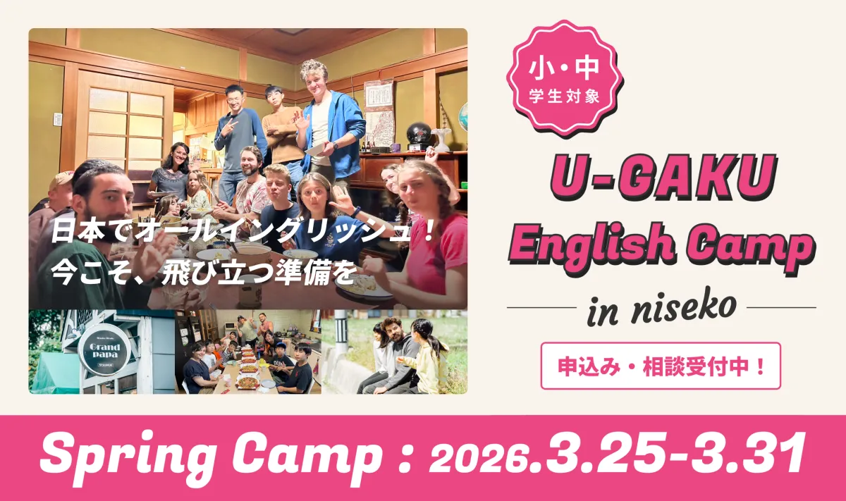 U-GAKU English Campは、ただの英語学習ではなく、子どもたちが「自分を知り、世界とつながる手段」としての英語を体得するための場を提供しています。ぜひ、この春、雪国ニセコで新しい学びの体験をしてみませんか?