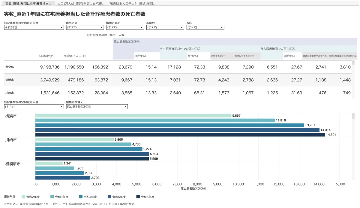 Salesforce社のTableauを利用しています。具体的には、神奈川県内の医療機関から集約されたデータを基に、在宅医療に関する情報の可視化を行います。システムは、次のような多様なデータを提供し、地域での医療課題を理解するための強力なツールとなります。