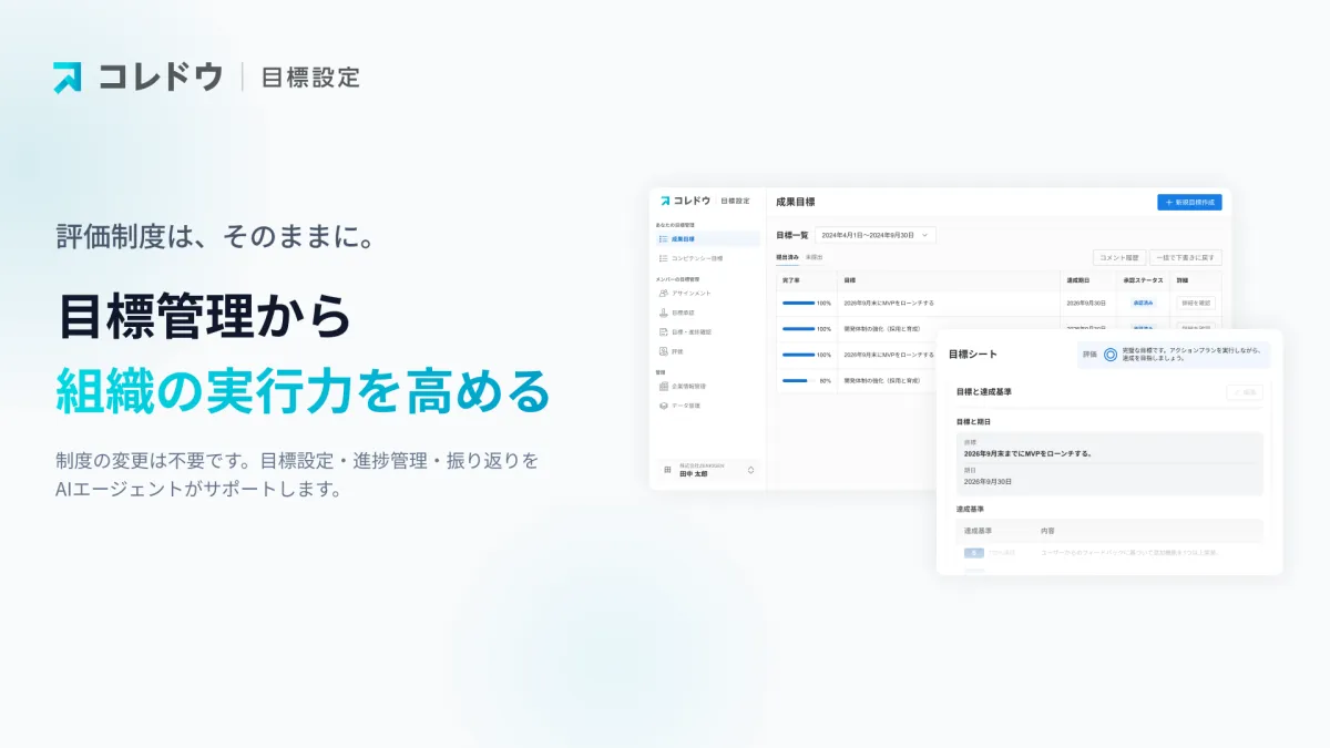 コレドウは、今後もAI技術を駆使して、目標設定支援の高度化やマネジメント支援の自動化を進めていく予定です。また、進捗が停滞する際の改善提案も行い、組織全体の実行力を向上させるための基盤を提供します。コレドウは単なる目標管理ツールではなく、組織が持続的に成長するための重要なマネジメント基盤を構築することを目指しています。