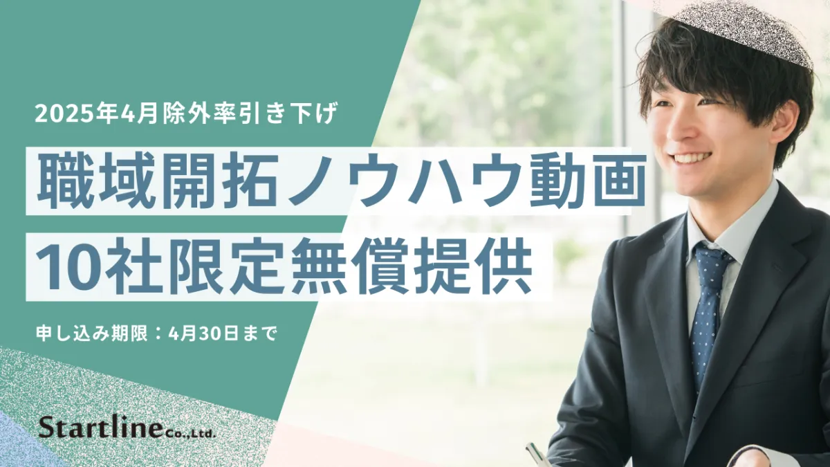 株式会社スタートライン(本社:東京都三鷹市、代表取締役:西村賢治)は、2025年4月1日より実施される除外率引き下げに関連する支援策を発表しました。これは、障害者雇用促進法の改正に伴うもので、除外率が一律で10ポイント引き下げられることが背景にあります。これに対応し、同社は「職域開拓ノウハウ動画」を10社限定で無償提供することを決定しました。