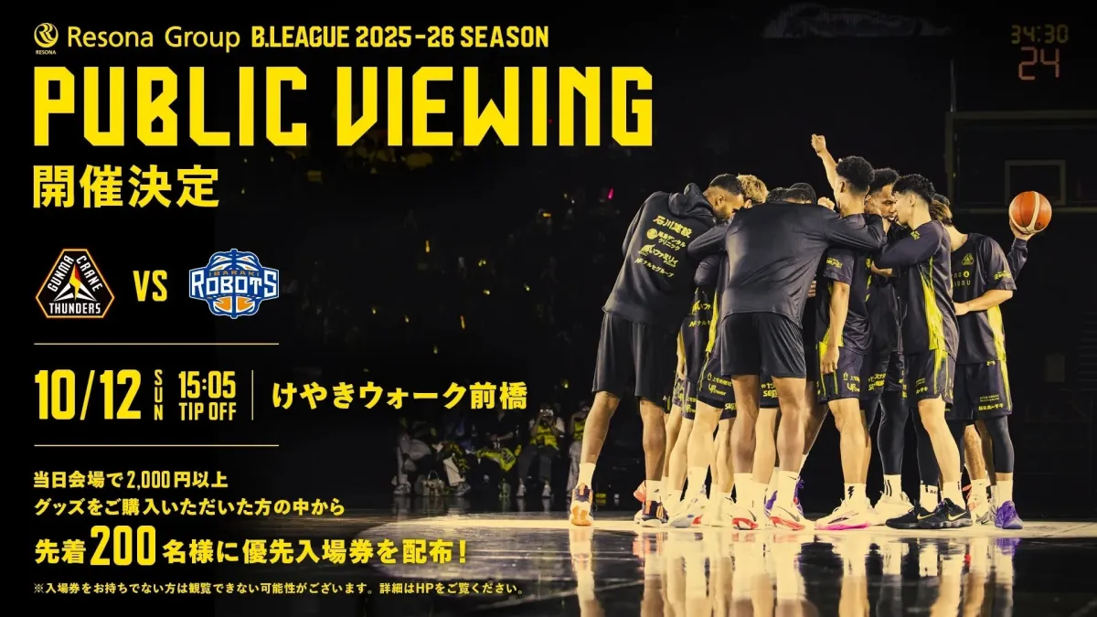 群馬クレインサンダーズのファンに朗報です!2025年10月12日(日)、アウェイの茨城戦を盛り上げるパブリックビューイングがけやきウォーク前橋にて開催されます。サンダーズのファン同士でリアルタイムの試合を観戦できる貴重な機会ですので、ぜひ足を運んでみてください。