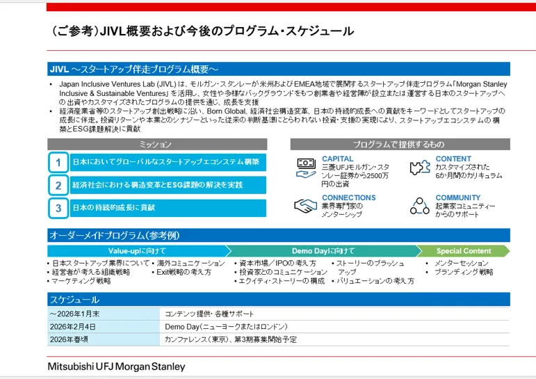 2025年3月5日に始まるスタートアップ伴走プログラム「Japan Inclusive Ventures Lab(JIVL)」について、三菱UFJモルガン・スタンレー証券株式会社は4社の採択を発表しました。このプログラムは、特に女性や多様なバックグラウンドを持つ創業者や経営者が設立または運営する日本のスタートアップの事業構築を支援することを目的としています。