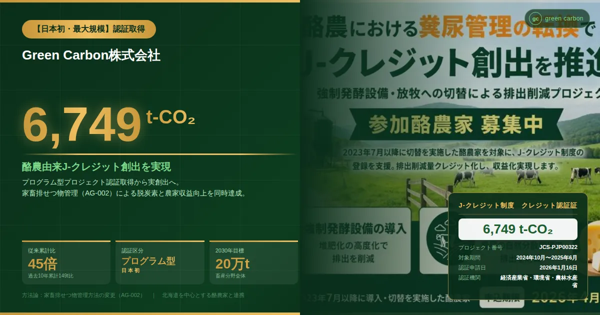 Green Carbon株式会社は、環境負荷低減を目指すカーボンクレジット創出事業の先駆者です。同社が展開した酪農由来のプログラム型プロジェクトにおいて、6,749トンのCO2を削減するJ-クレジットの創出に成功しました。これは、過去10年間で発行された全体の約45倍にあたります。