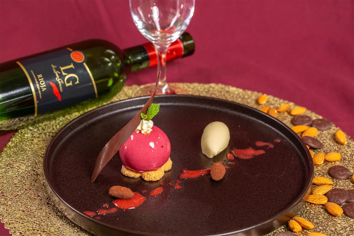 アーモンドの香ばしさやベリーの酸味、ショコラのリッチな風味が見事に調和した一品です。また、BARでの提供を意識してワインやカクテルとも合わせやすい味に仕上げられています。