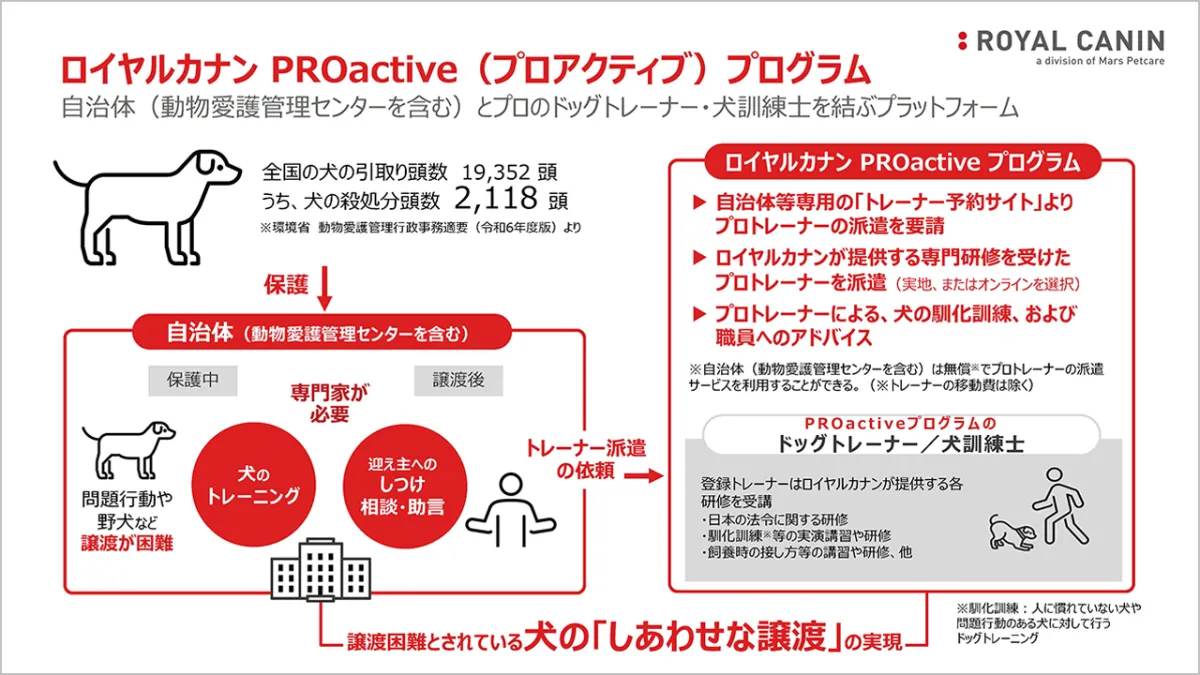 多くの自治体では、保護犬の問題行動に悩まされており、社会化が不十分な犬が多く存在します。この新プログラムでは、プロのトレーナーによる保護犬の馴化訓練が行われ、特に地域特有の問題に詳しい専門家が支援することで、犬の社会化と譲渡の機会が向上します。さらに、トレーナー予約サイトを通じて、地域の状況を熟知した専門家を簡単に見つけ、それに基づいた最適なトレーニングを実施できるシステムがあります。このサイトの利用は無償で、訓練費用もロイヤルカナンが負担するため、自治体にとって大きな助けとなるでしょう。