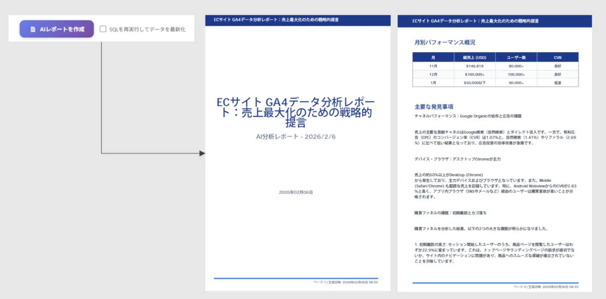 ユーザーが見たいデータを指示すると、生成AIが迅速に分析結果を出力。また、データベースに対するSQLを発行して結果を確認できるため、情報の正確性に対する安心感も提供されています。さらに、それぞれのデータに対する次のアクションを提案してくれる機能も備わっています。