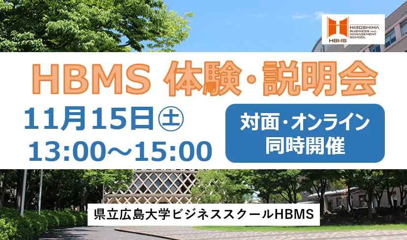 働きながら学ぶ社会人向けのビジネススクール、HBMS(県立広島大学大学院経営管理研究科)が、受験を考えている方を対象に体験・説明会を開催します。これは、MBA(経営修士)の学位を2年間で取得できる、地域唯一の機会です。参加者はHBMSの授業を実際に体験し、学校について深く理解することができます。この機会にぜひご参加ください。