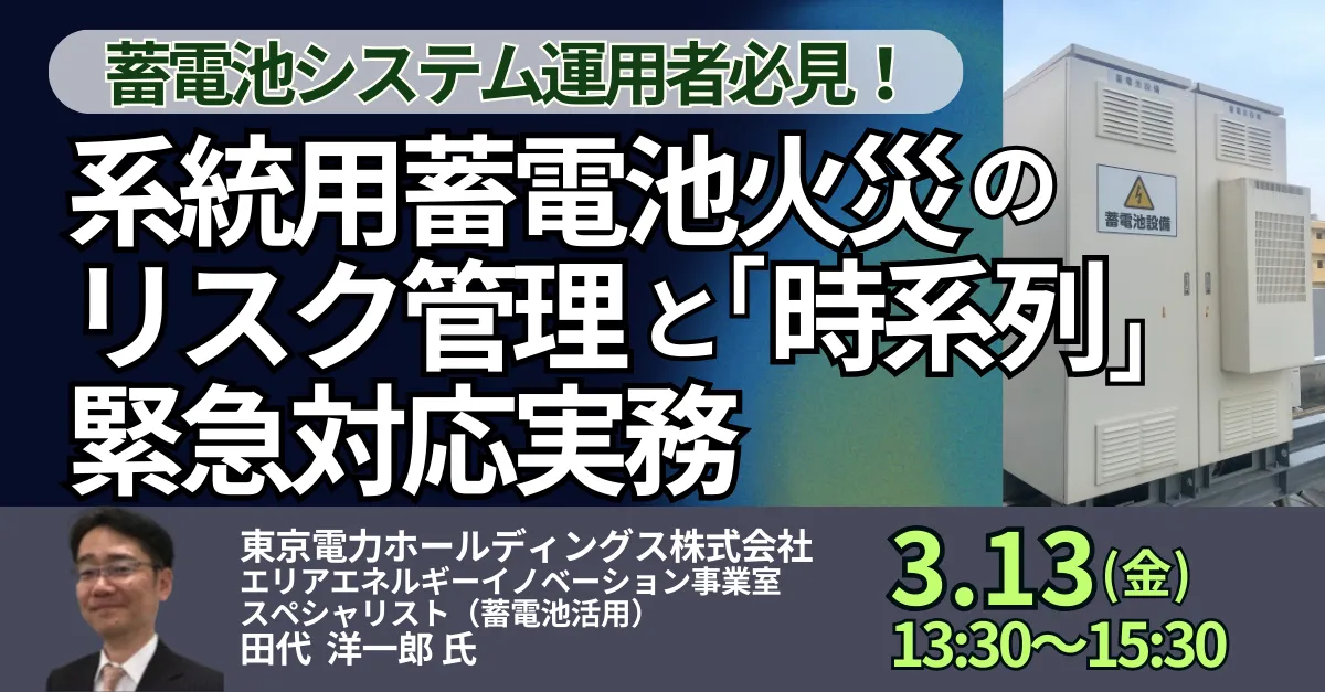 この度、JPI(日本計画研究所)では、東京電力ホールディングスの田代洋一郎氏を講師に迎え、系統用蓄電池の火災リスク管理に関するセミナーを開催します。セミナーは2026年3月13日(金)に行われ、リスク分析や火災発生時の対応方法など、実践的な知識を提供する内容です。