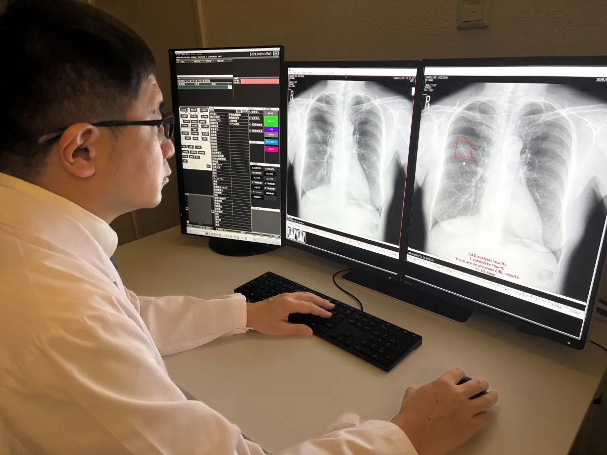日本では肺がんの検診に際して胸部X線画像を使用しており、厚生労働省による指針では「2名以上の医師による二重読影」が推奨されています。しかし、医師の数が不足している現状では、医師1名とAIを併用することで、診断の効率が上がり、医師の負担軽減が期待されています。