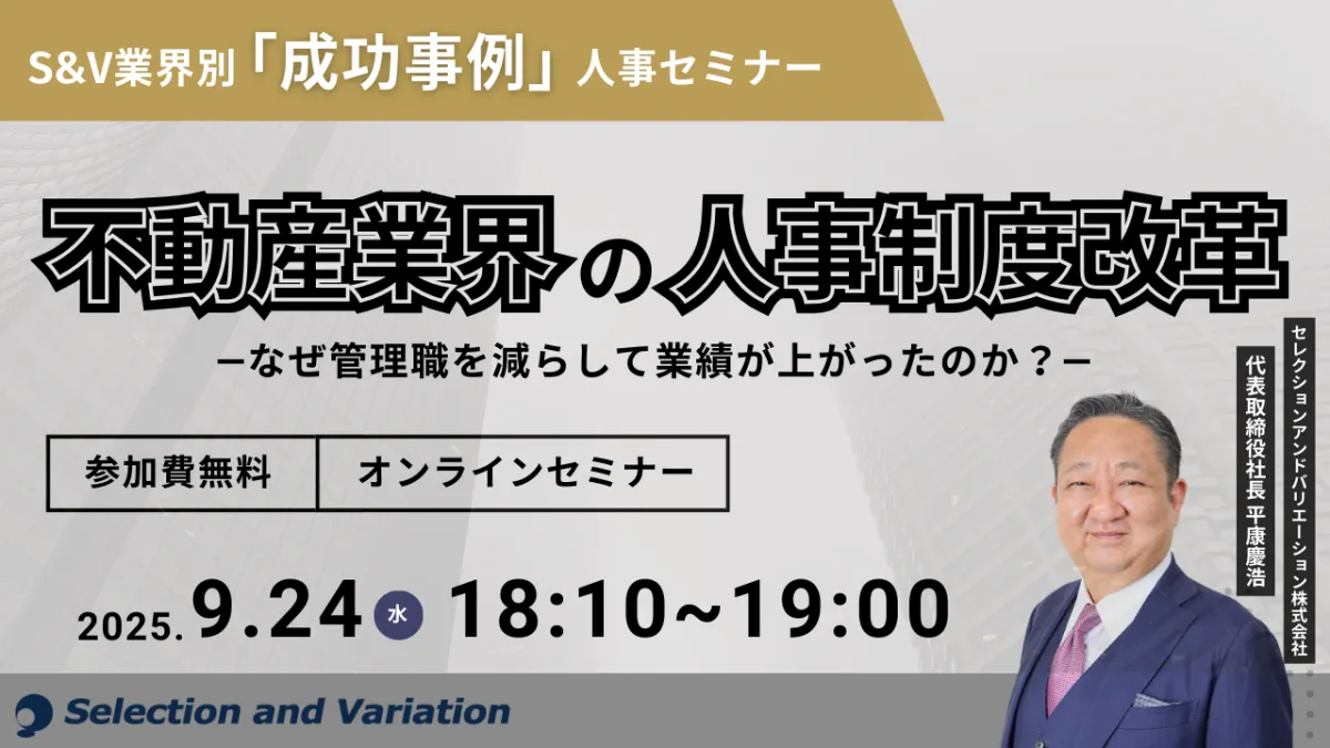 2025年9月24日(水)18:10から、セレクションアンドバリエーション株式会社が主催する人事セミナーが開催されます。本セミナーは、特に不動産業界に焦点を当てた、人事制度改革についての具体的なケーススタディを紹介します。