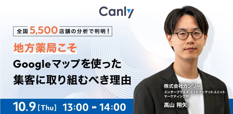 2025年10月9日、株式会社カンリー主催でオンラインセミナー「全国5,500店舗の分析で判明!地方薬局こそGoogleマップを使った集客に取り組むべき理由」が開催されます。このセミナーは、調剤薬局業界における新たな集客戦略を探る内容で、特に地方薬局にフォーカスが当てられています。