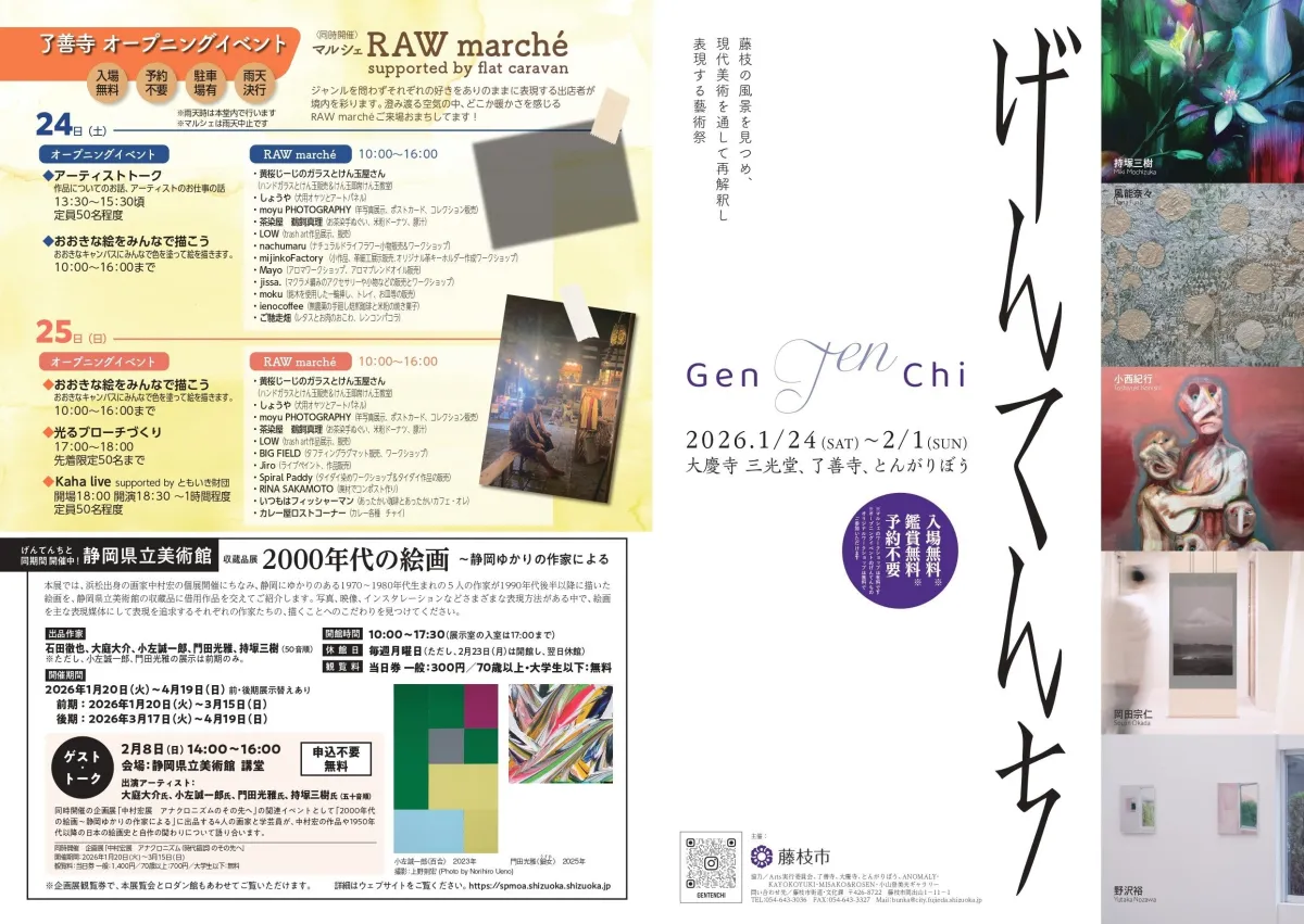 本展は1月24日(土)から2月1日(日)までの間、藤枝市内の3ヶ所で行われます。会場は、大慶寺、了善寺、旧藤枝製茶貿易商館「とんがりぼう」の3カ所。各会場では、展覧会に加え、体験型ワークショップやインスタレーションライブが予定されています。