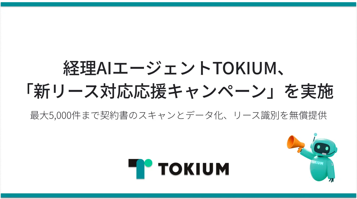 経理AIエージェントを展開する株式会社TOKIUMは、2027年4月から施行される新しいリース会計基準に対応すべく、「新リース対応応援キャンペーン」を実施しています。このキャンペーンは、2025年11月1日から2026年2月28日までの間、先着50社において「TOKIUM AIリース判定」と「TOKIUM契約管理」への申し込みによって特典が受けられます。