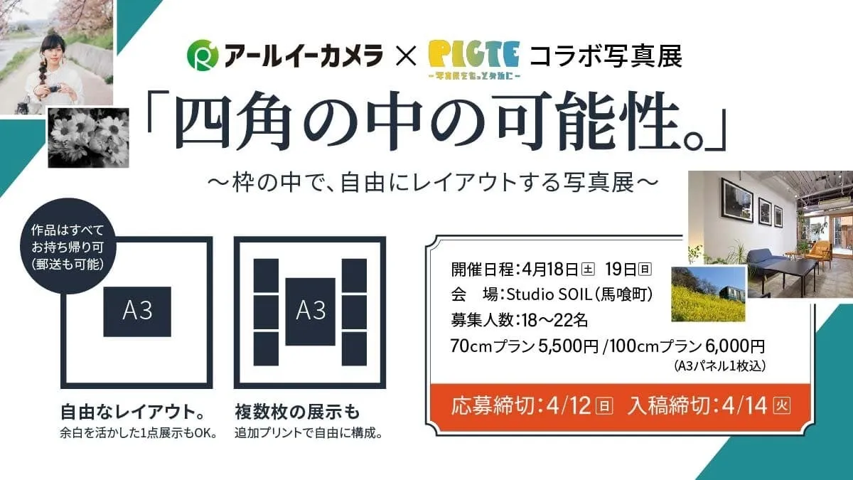 2026年4月18日から19日、東京都日本橋にある「Studio SOIL」で、アールイーカメラとPICTEがコラボレーションした新たな参加型写真展「四角の中の可能性。」が開催されます。この展示では、個々のクリエイターが自分のスタイルで「四角い世界」を自由に表現できる絶好の機会を提供します。