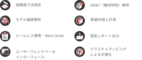 MetroX Proに合わせて、プロフェッショナル向けの測定ソフト「Revo Measure」も同時にリリースされました。このソフトウェアでは、点群やメッシュデータをCADモデルや図面と比較することで、形状や寸法、品質評価を行うことが可能です。